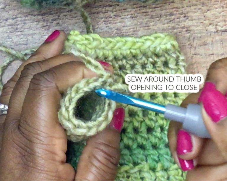 Cut yarn leaving a 12” tail. Using yarn needle and tail. Sew along the top edge of the Thumb to close.