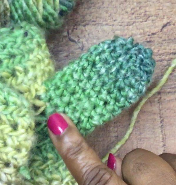 sc around thumb opening [12]; continue sc in each st, in a spiral until you reach approx. 2” in length.