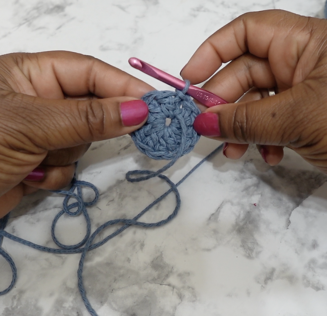 Rnd 1: Place 11 dc into the magic circle (the ch 3 will count as your first dc), pull the circle close, sl st in the first dc to join. [12]