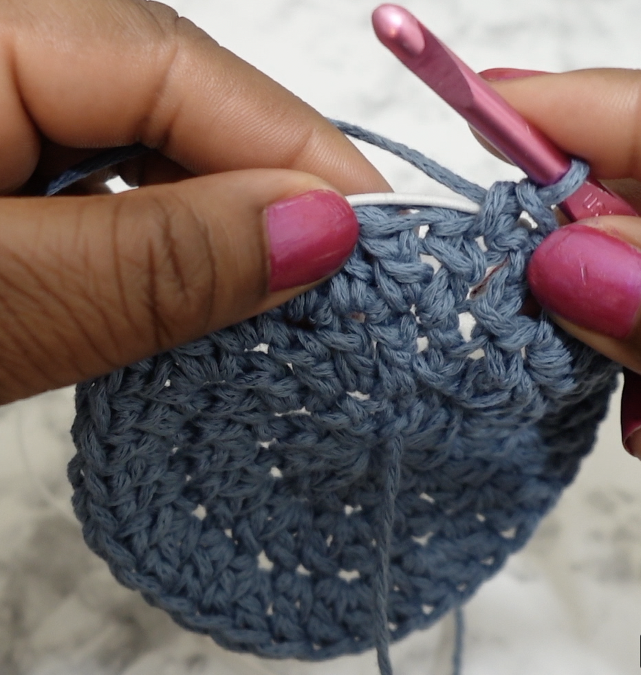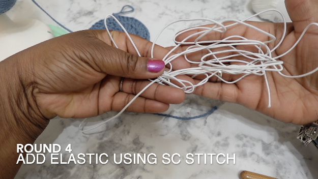 Rnd 5: Attach elastic to the first st of the round, using a knot. Hold elastic while single crocheting in each stitch around. Tie together the starting elastic band with the ending elastic band to secure. Sl st in the first dc to join. [36]
