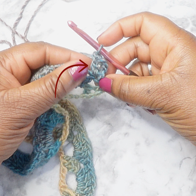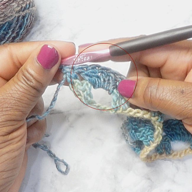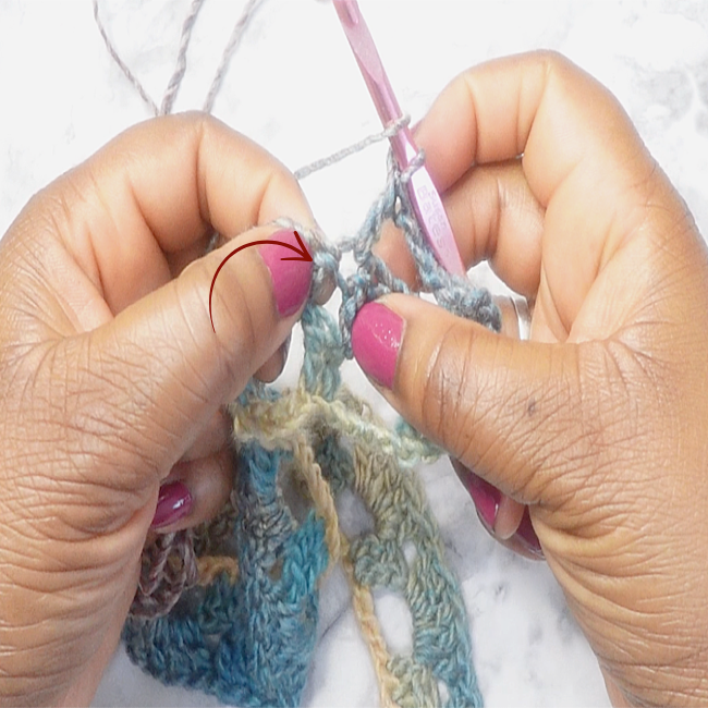 5dc- place 5 double crochet stitches into the ‘open’ space
